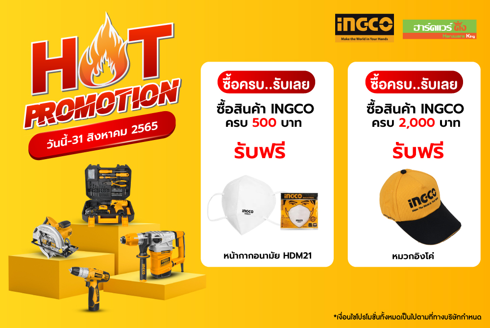 2.เมื่อซื้อสินค้าแบรนด์ Ingco ครบ 500 บาทขึ้นไป รับหน้ากากอนามัย HDM21