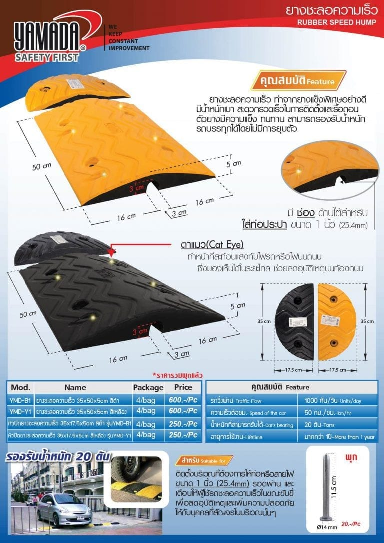 • ยางชะลอความเร็ว ทำจากยางแข็งพิเศษอย่างดี มีน้ำหนักเบา สะดวกรวดเร็วในการติดตั้งและรื้อถอนตัวยางมีความแข็ง ทนทาน สามารถรองรับน้ำหนักรถบรรทุกได้โดยไม่มีการยุบตัว